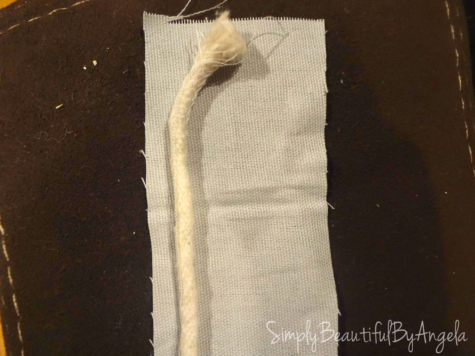 First you measure out how long you need your piping strips to be. Then you cut out strips of fabric (mine were about 2.5 inches wide) and sew them together as needed. Next, you lay one piece of piping on the strip, fold over the fabric, lay the other piece of piping right next to it (it should be touching it!) and then run it through the sewing machine to sew a stitch in between the two ropes.