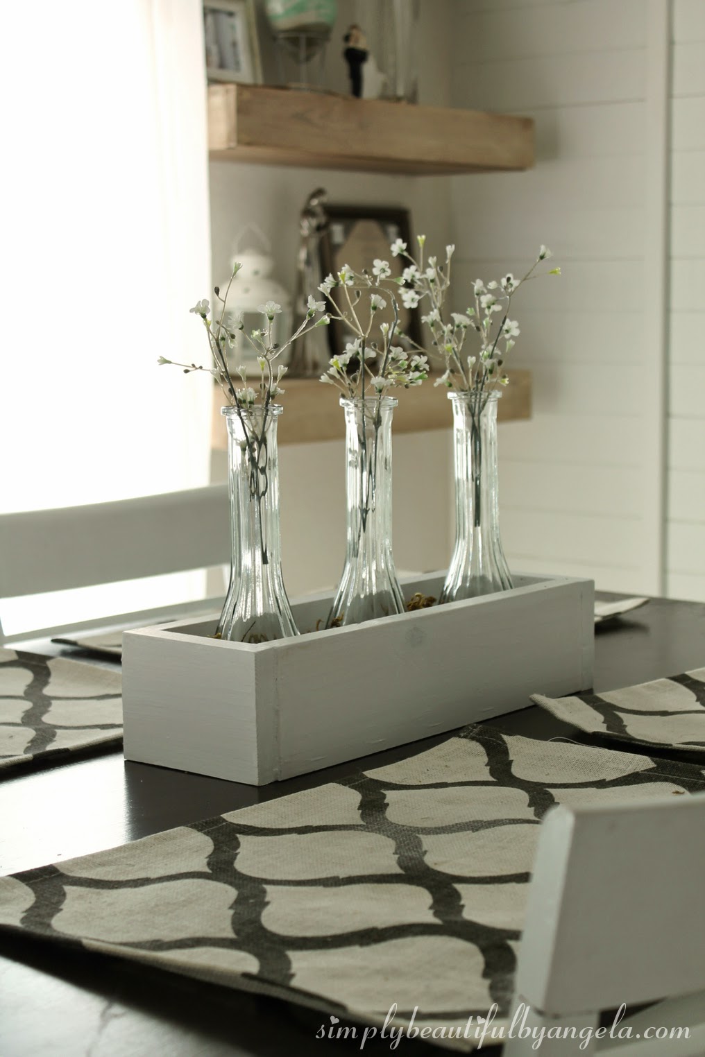 To dress it up for spring I added three bud vases (from the dollar store), some moss (also from the dollar store) and a few faux spring blossoms.
