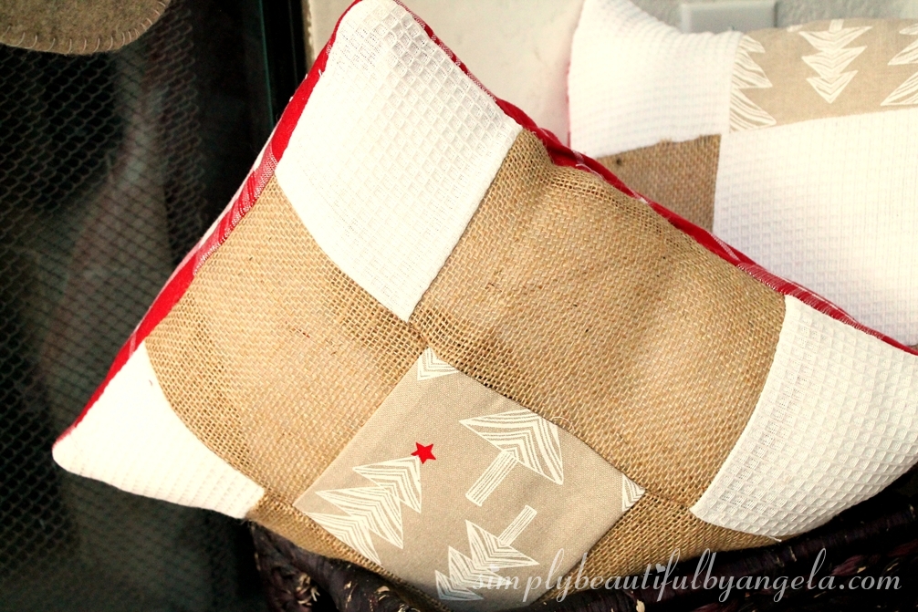 It’s so cozy cuddling up on the couch with this view of my Patchwork Pillows and my DIY Rustic Vase holding some logs.