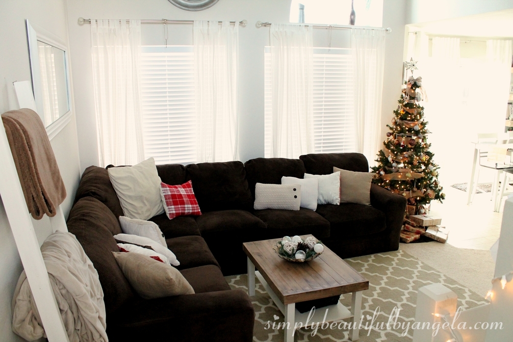 Coming down into our living room you can see the new pillow covers that I made this year using napkins from Homegoods and more Goodwill sweater pillows.
