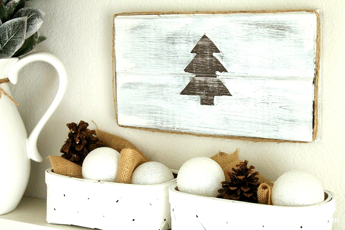 Finally we have our mudroom. I busted out my beloved DIY Christmas Tree Plank Art from last year and added some burlap, pinecones and snowball ornaments to the baskets below it.