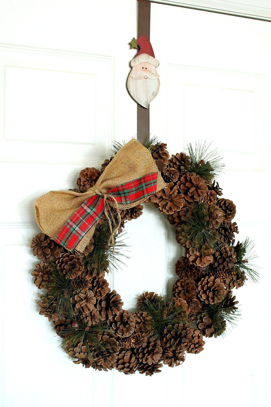 As much as I love the wreath on our front door, this pincone one is a close runner up. I purchased it at the Goodwill this summer for just $3. It just needed the broken berries cut off and a nice bow added to it : )