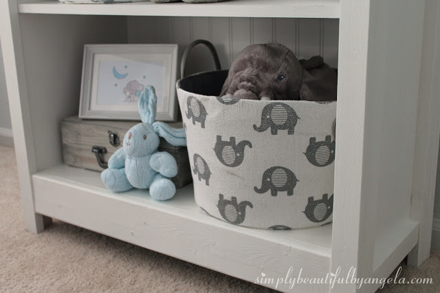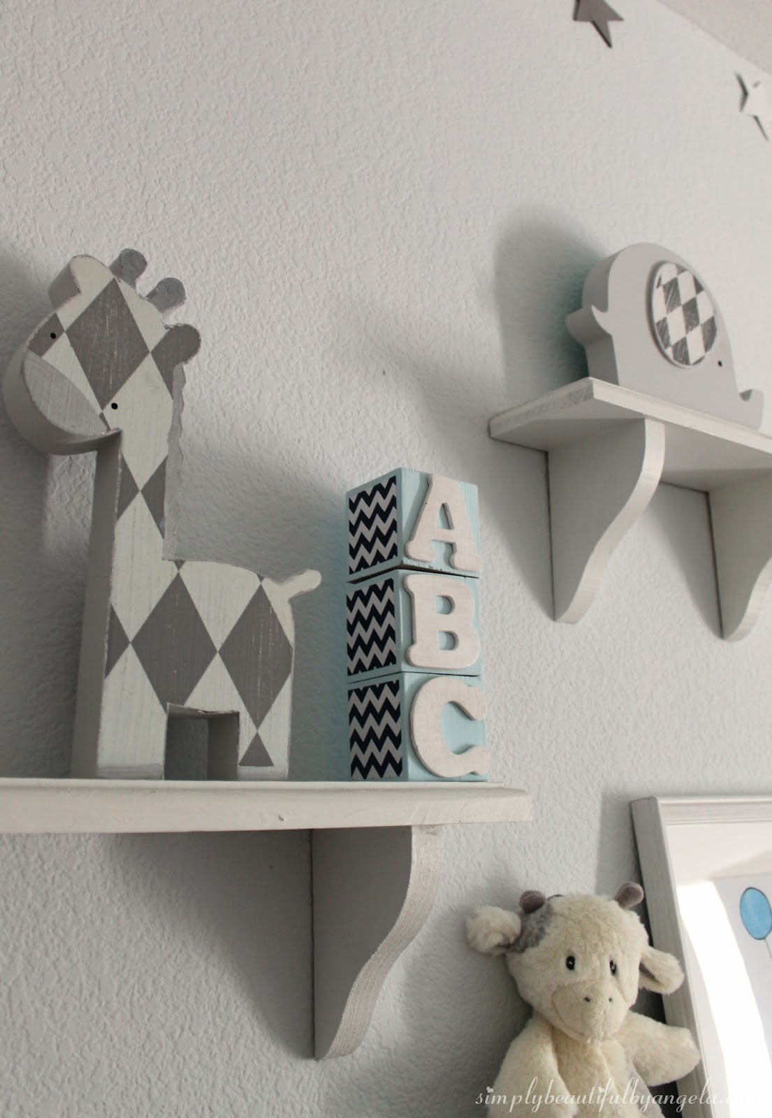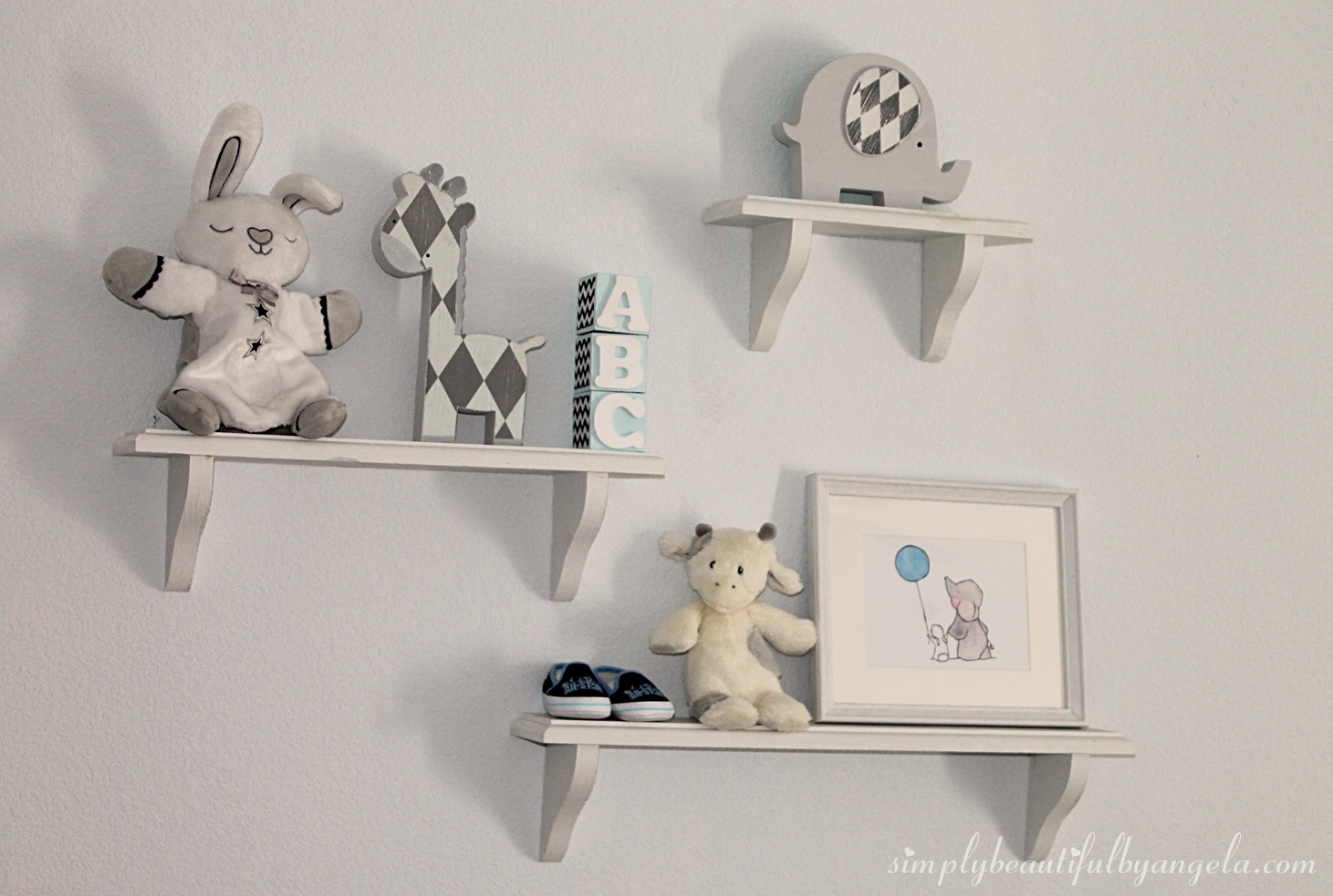 If you’ve seen what Tristan’s nursery used to look like you may notice that I used the same shelves on the space above the dresser. I was even able to reuse the wooden giraffe and elephant by painting them.