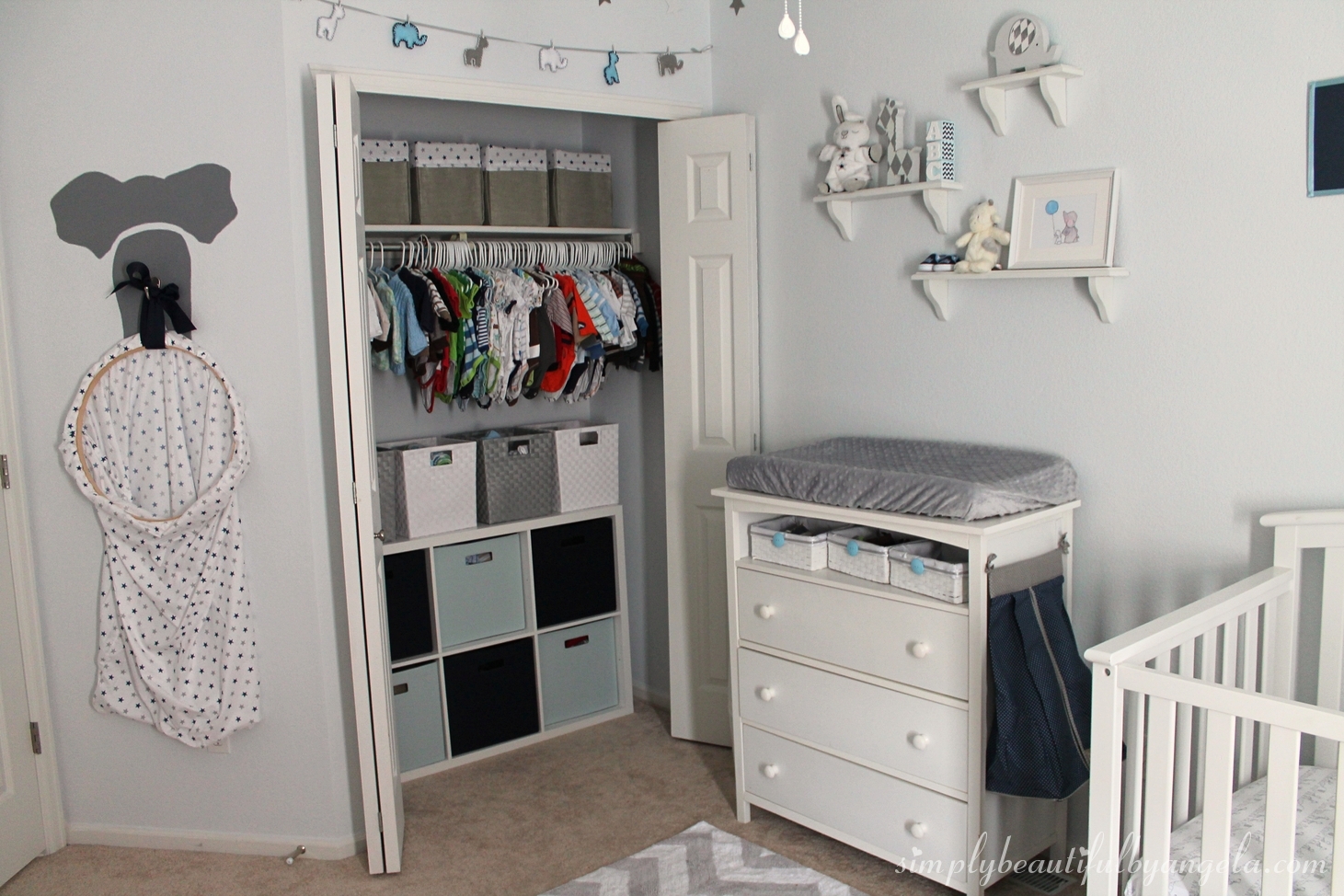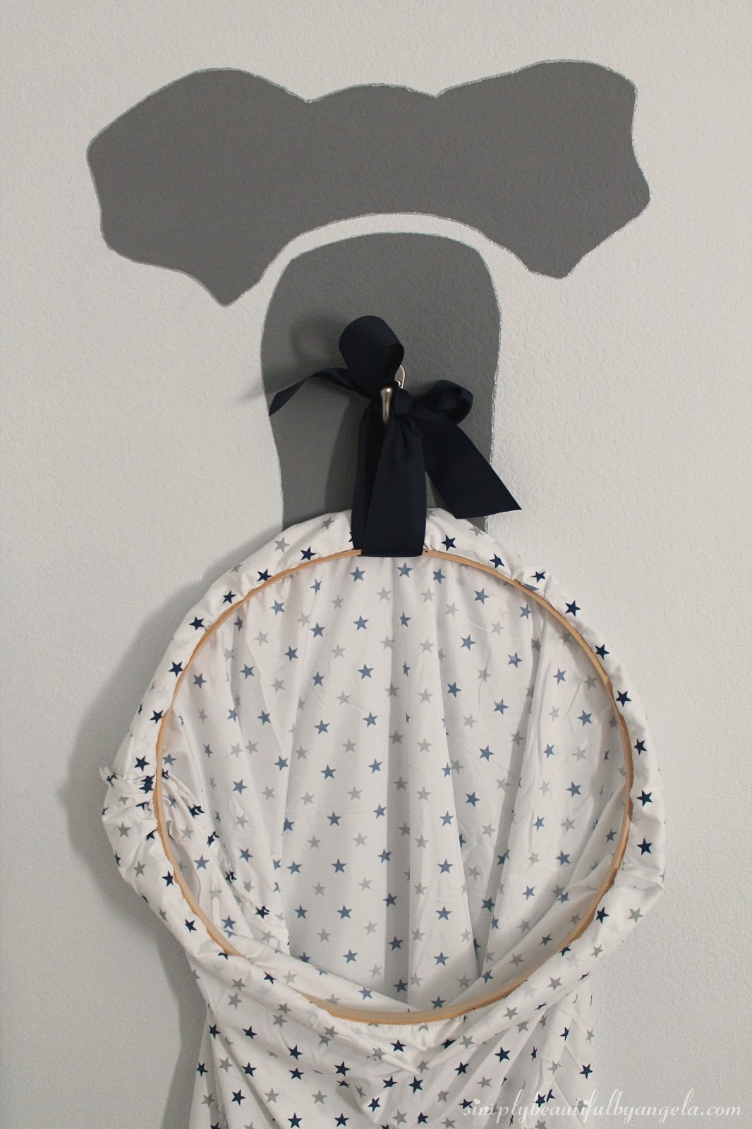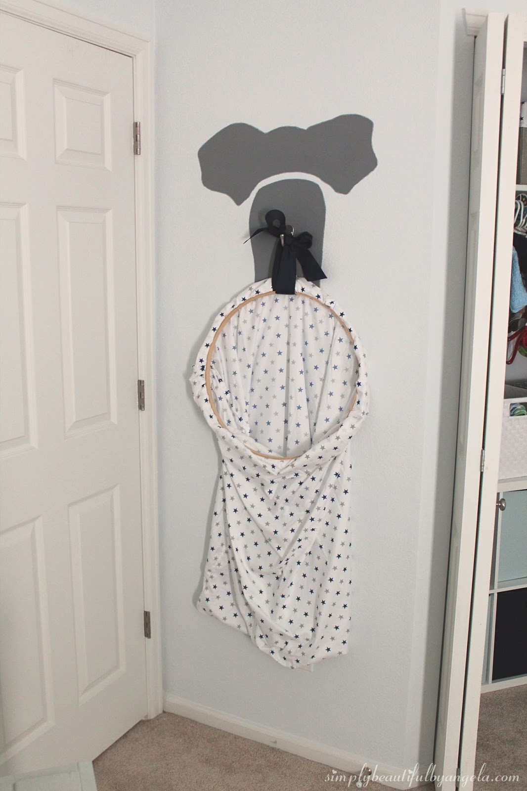 You may notice the cute elephant butt that’s holding up his hanging hamper (tutorial here) behind the door.