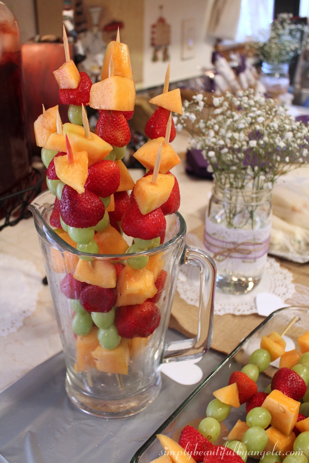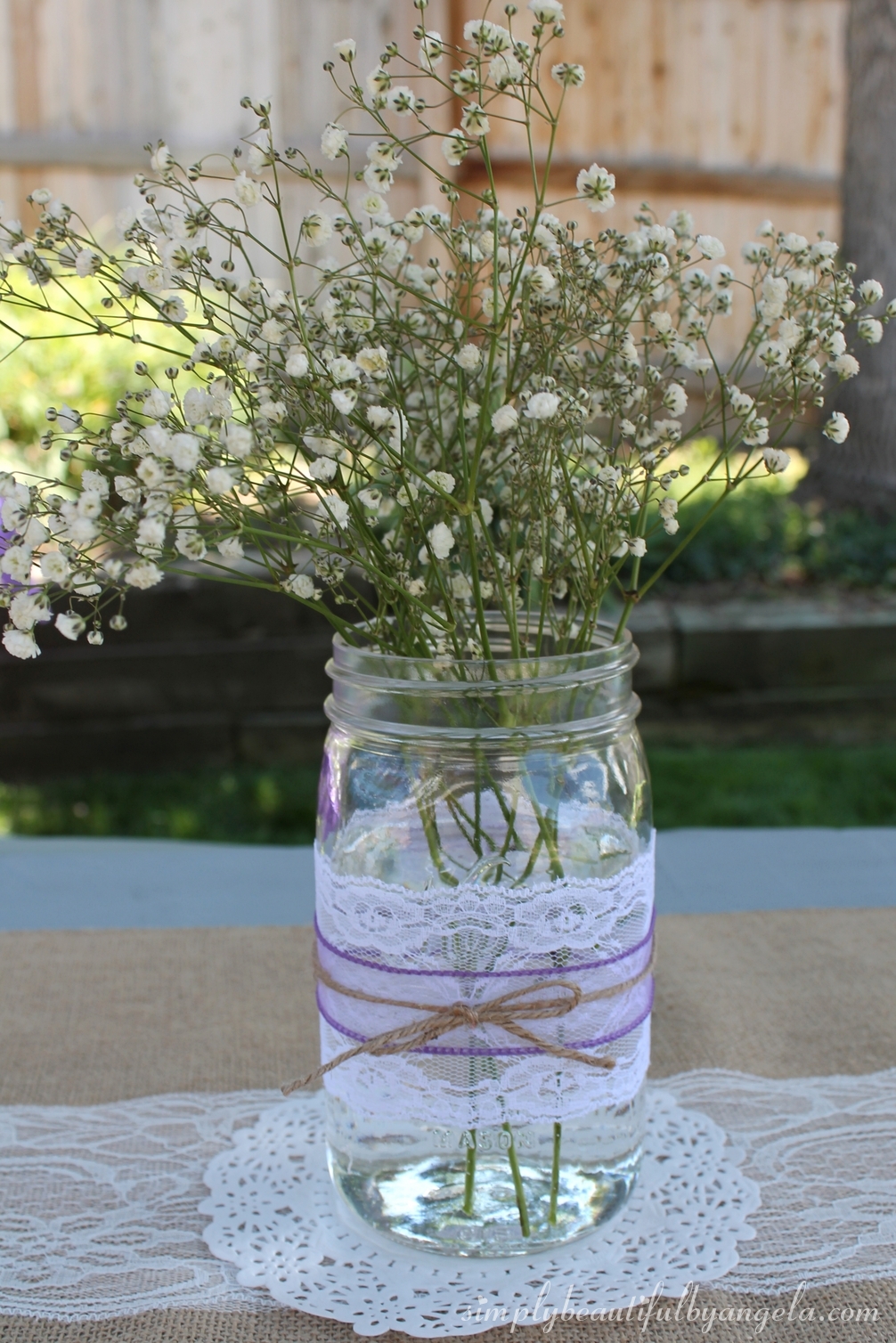 I decorated a case of mason jars with burlap and lace and popped some fresh Baby’s Breathe in each one to use as centerpieces.
