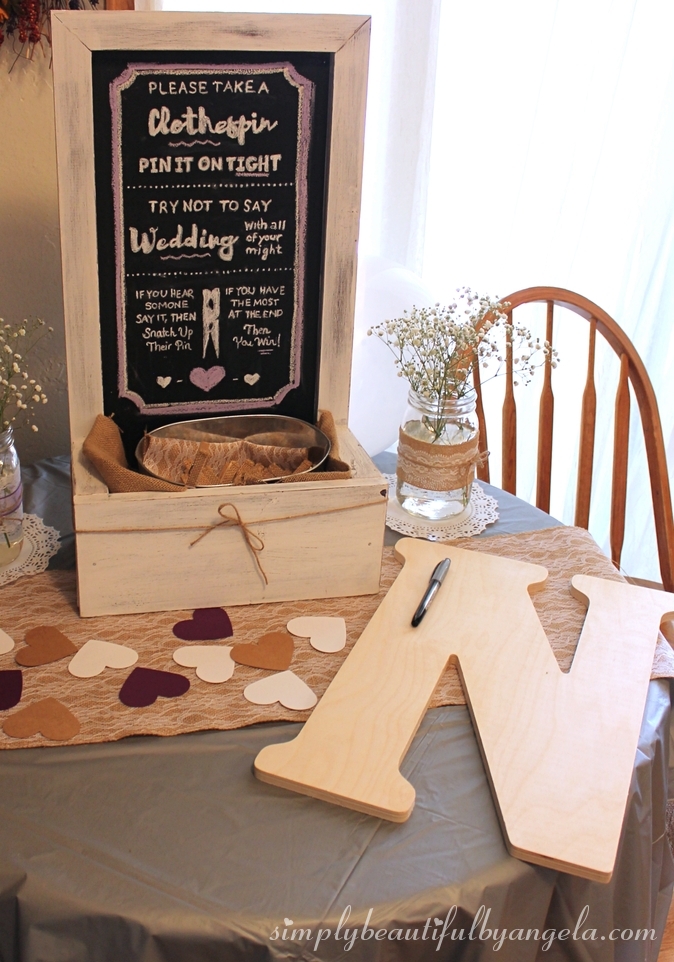As guests walked in they were greeted with a table that had a DIY chalkboard that explained the infamous clothespin game and a big initial where they could sign their well wishes to the bride.