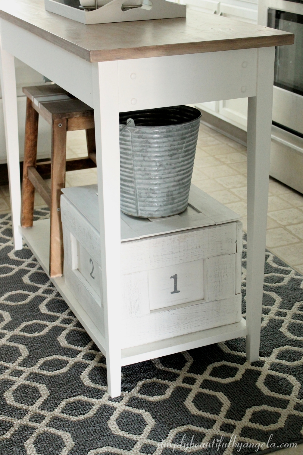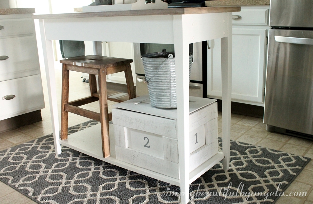 It fits perfectly under our table turned kitchen island. I use it to store random appliances that we don’t use on a regular basis which is nice because it frees up more counter space.