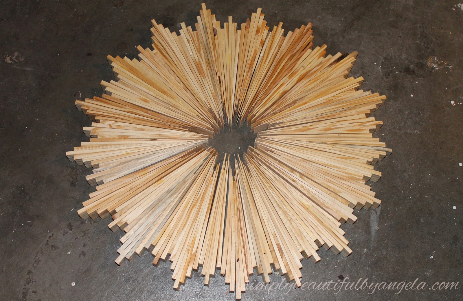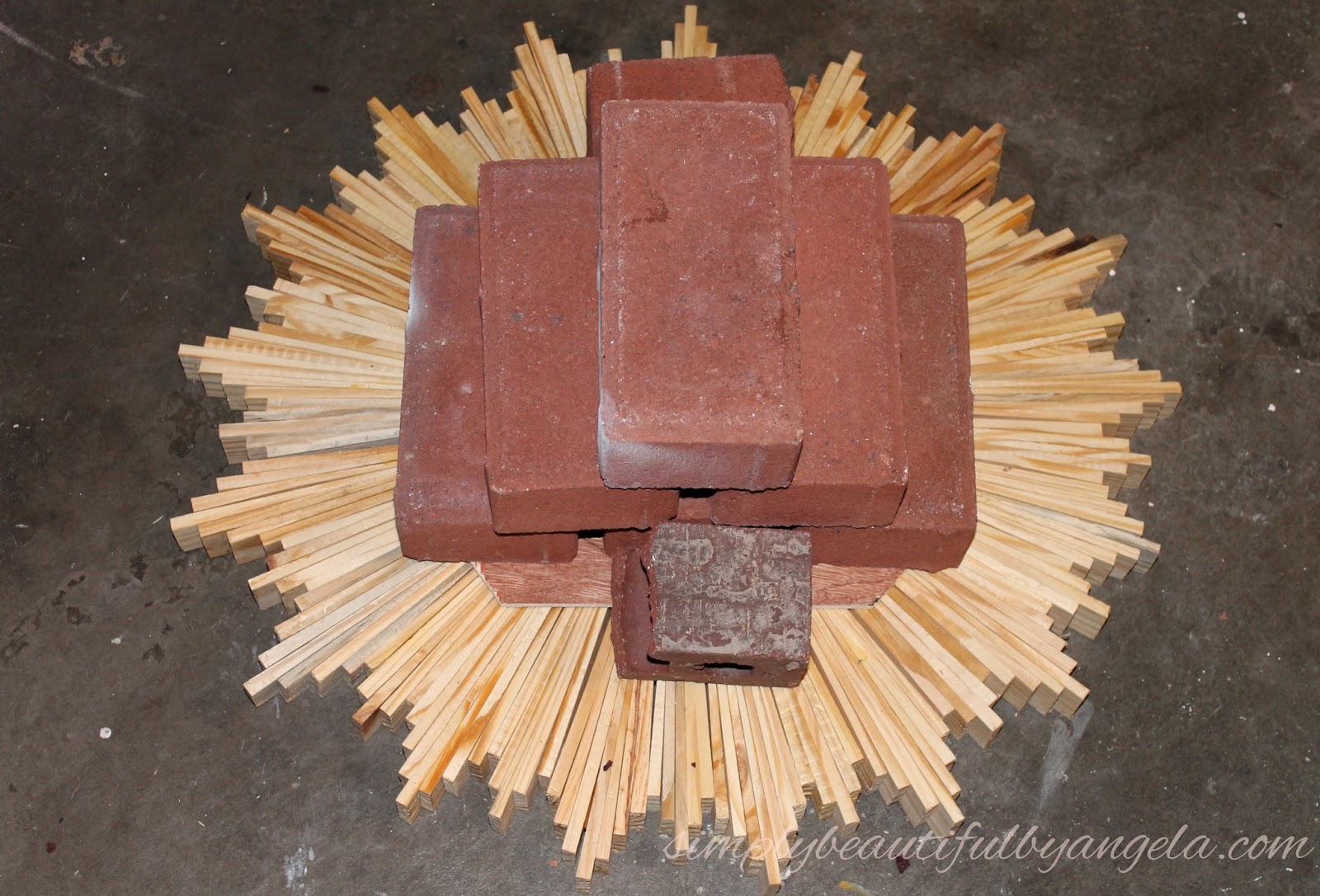 Once the wood glue dried on these bunches I removed the tape, applied some of the Power Grab to the back and then applied them to the plywood circle. Once all were on I placed bricks on top. I didn’t get a picture of this because I wasn’t sure it was going to work–but it did!