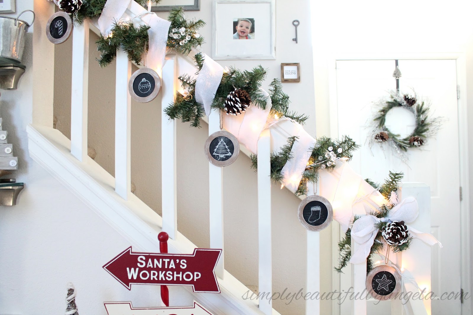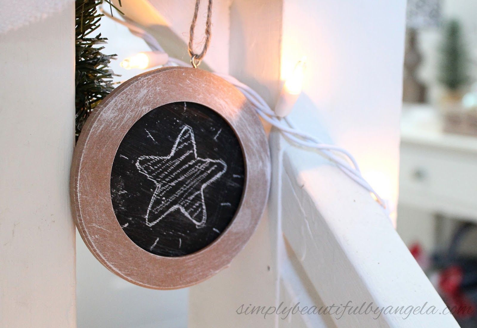 The adorable little chalkboards on the banister were made by dry brushing a few ornament frames from Hobby Lobby and painting the backs with chalkboard paint.