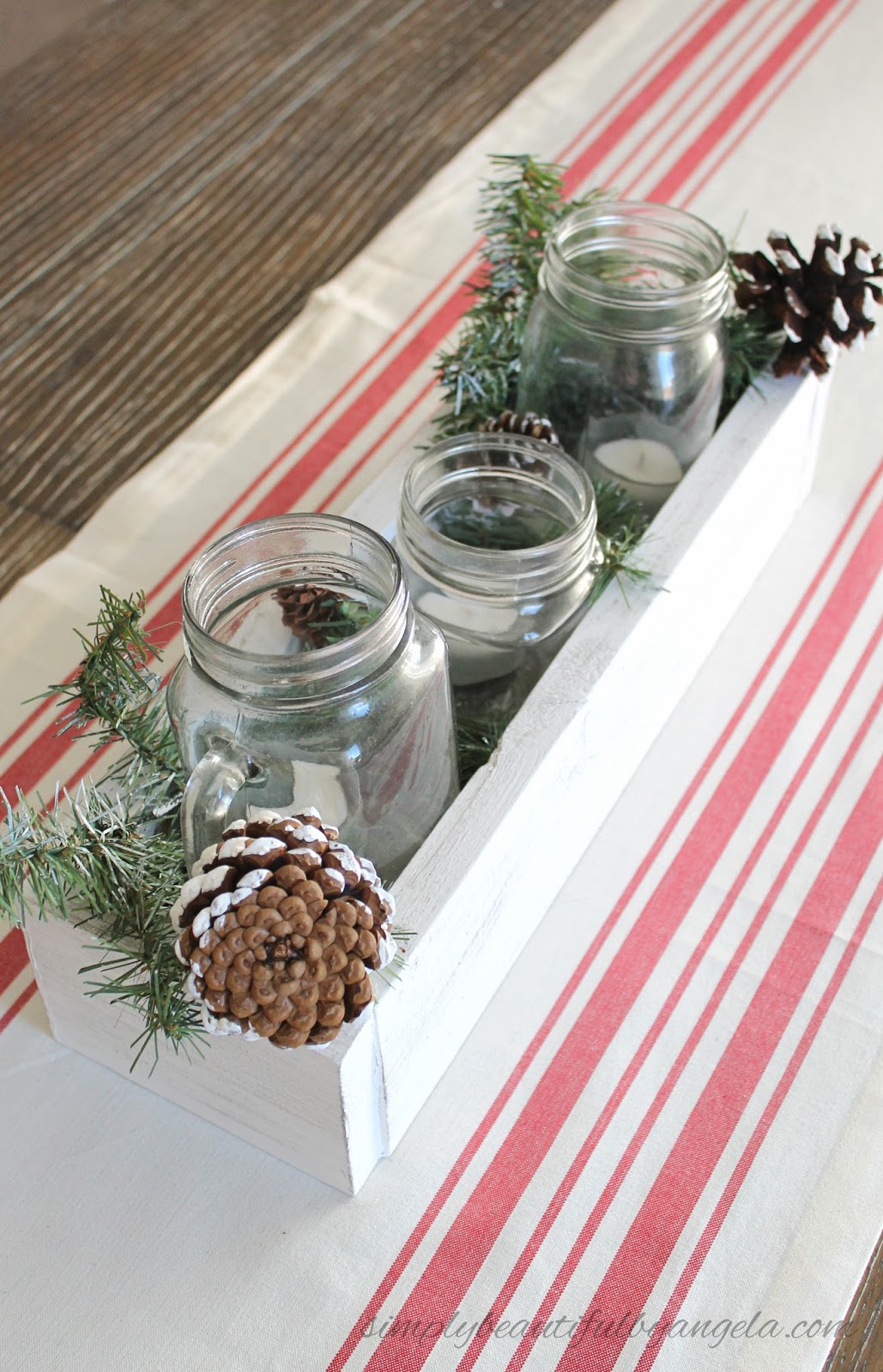 I dressed up our dining room table with a pretty red grain sack runner and a simple centerpiece that consists of various sized mason jars, candles, greenery and pinecones.