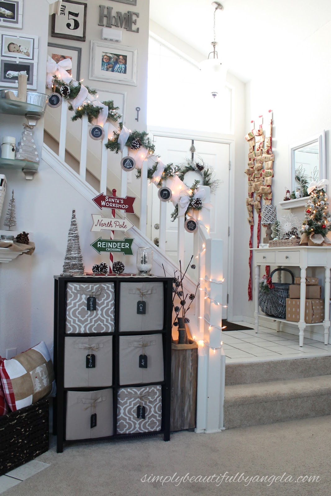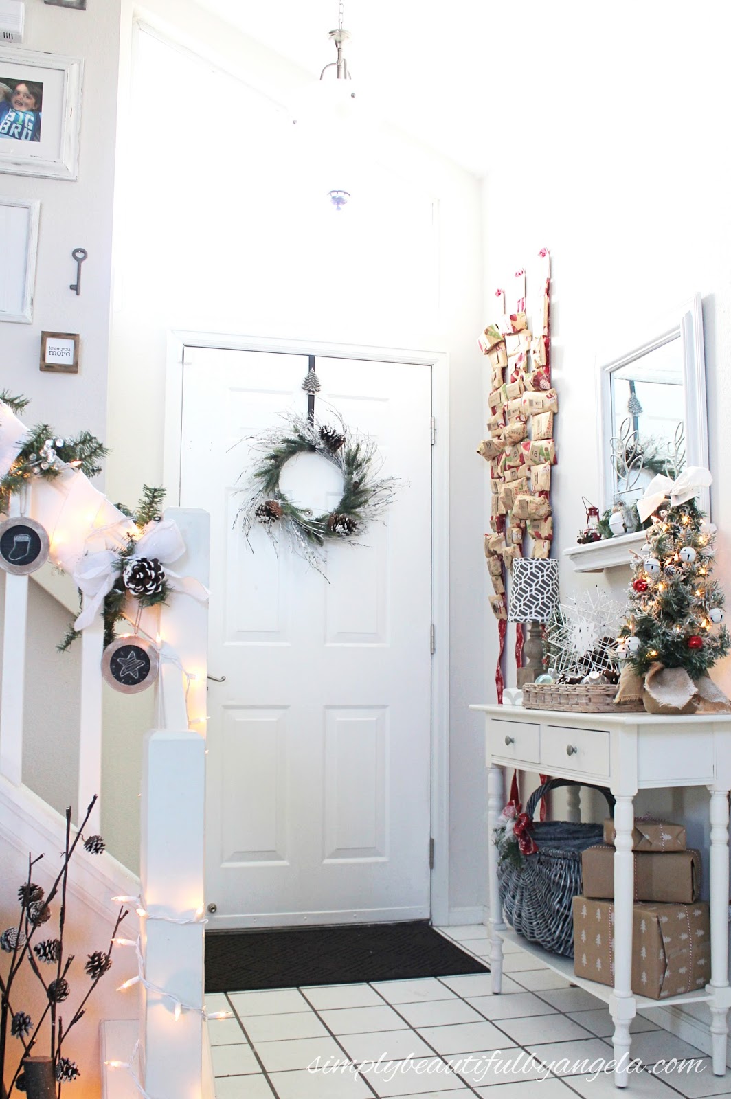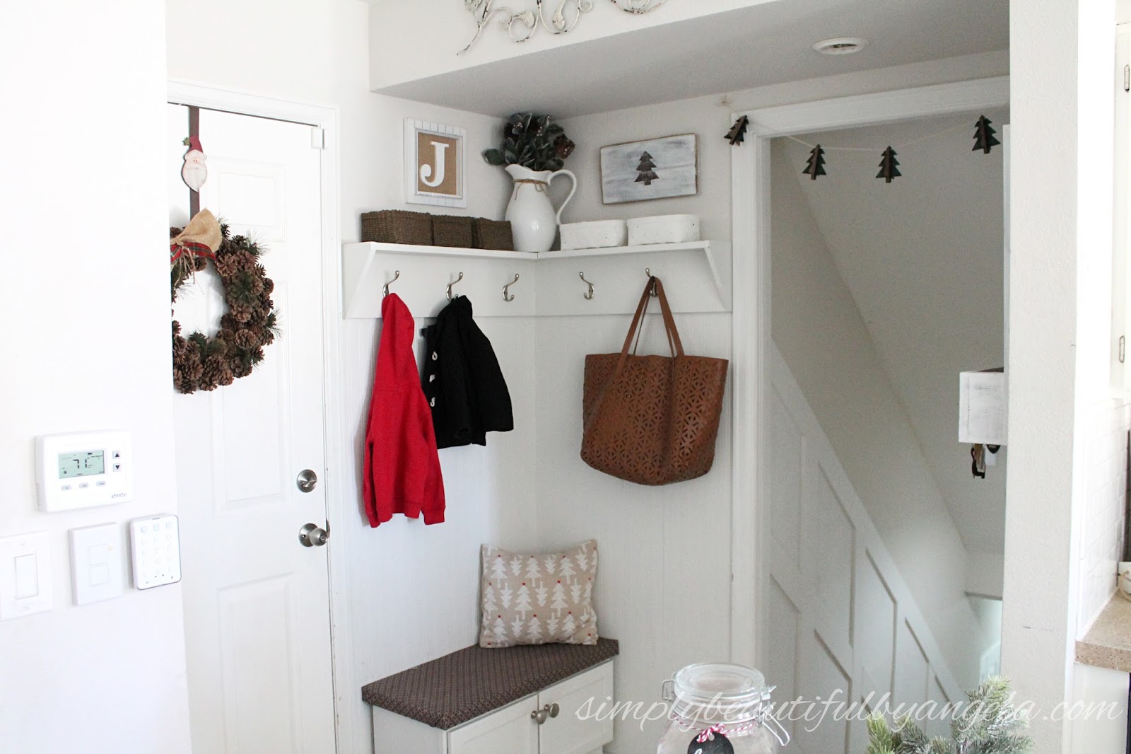 Up until last Friday when our garage door broke (boooo….) the mudroom area functioned as our main entry to and from the house. So of course I like to add a little bit of Christmas cheer in this area too! And since we took off the basement door and installed board and batten on the staircase, this area feels so much more open.