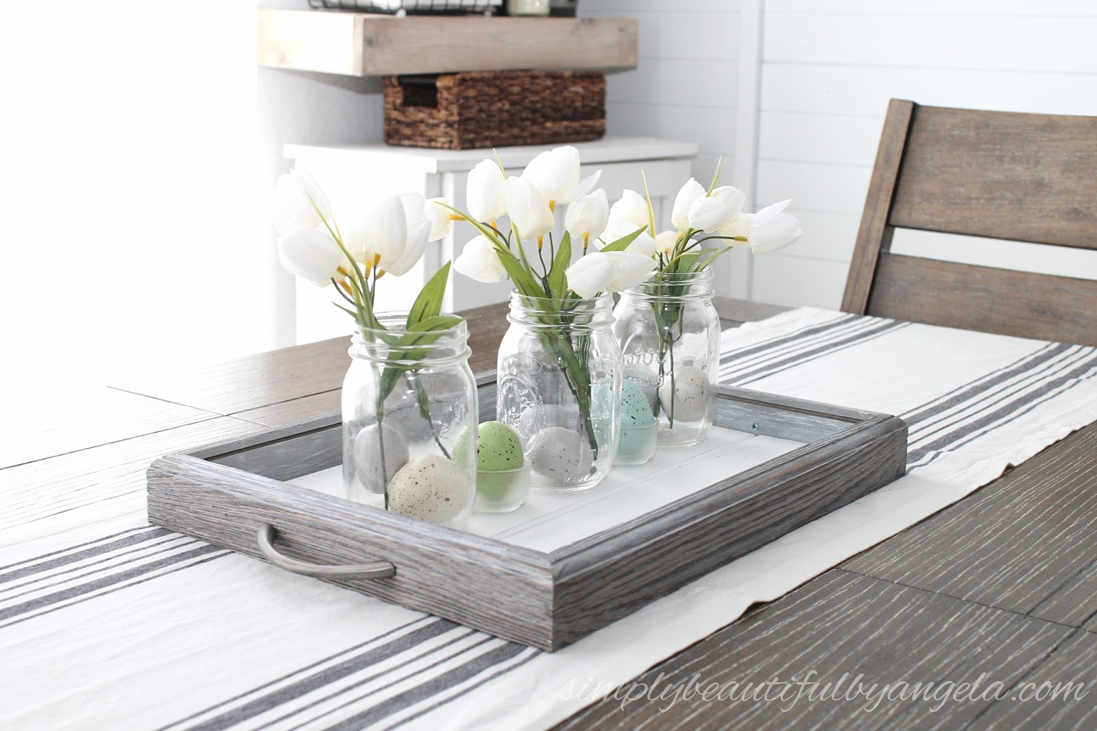 For the centerpiece I laid my DIY tray on a grain sack runner and filled mason jars with speckled eggs and mini tulips. Aren’t the mini tulips just the cutest??