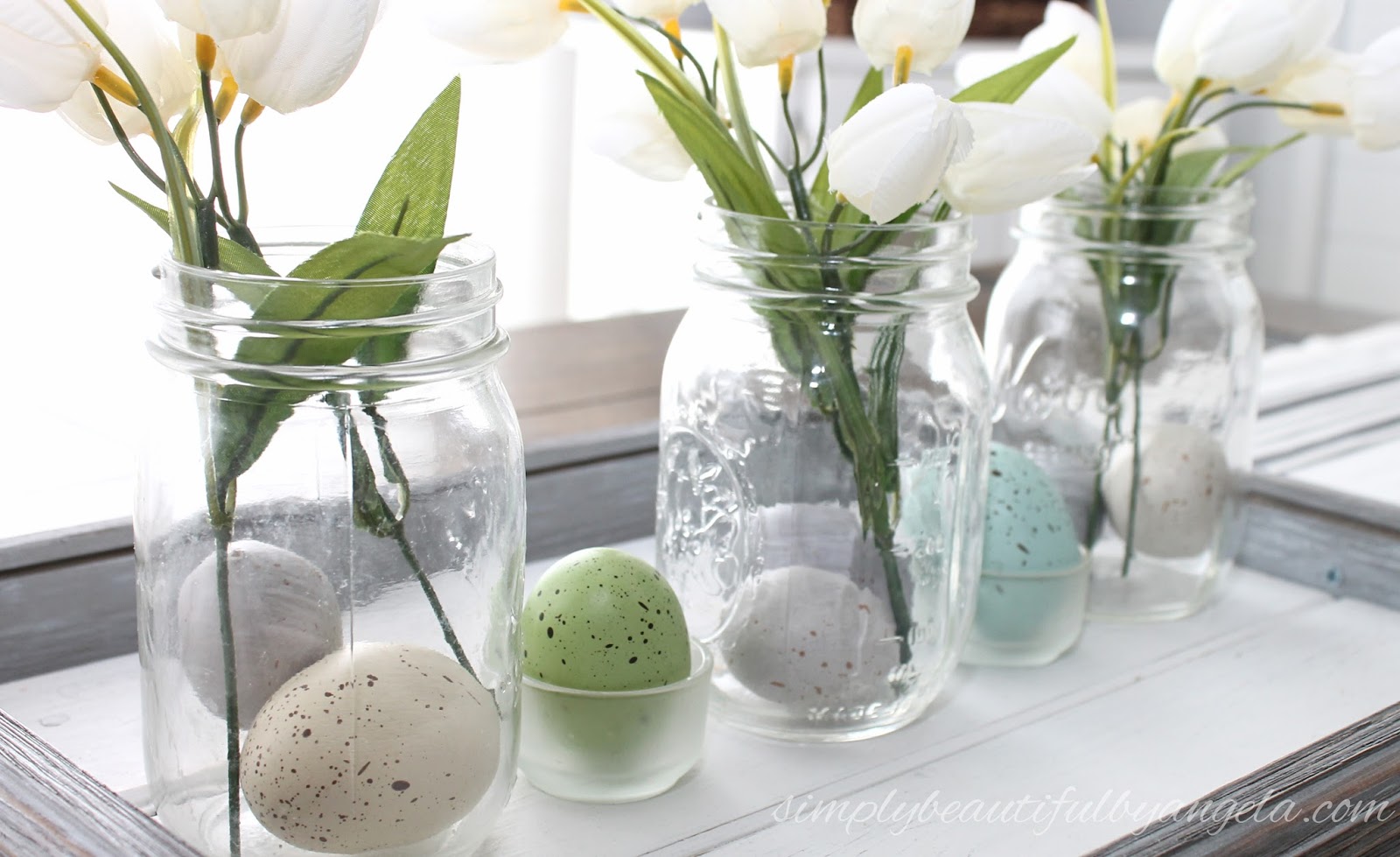 The eggs actually started off being on the tray but since the kids wouldn’t stop playing with them at mealtime I stuck them in the jars and ended up liking the look more.