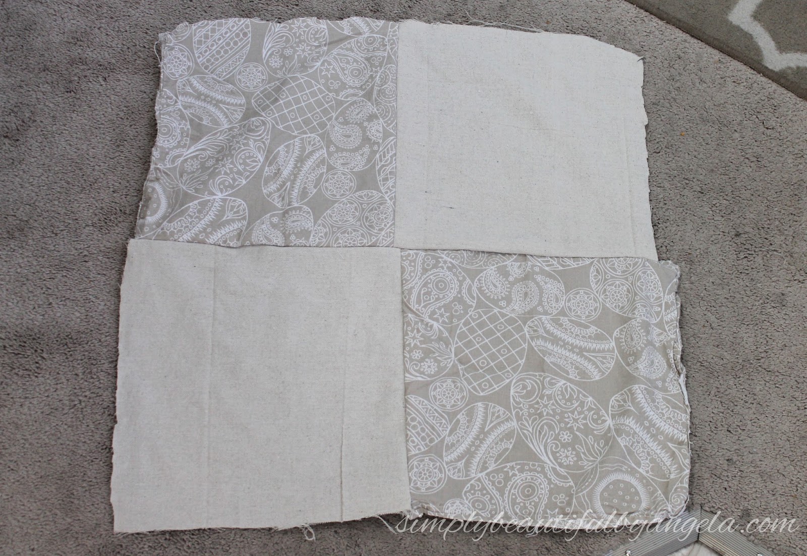 I found these Easter napkins last year at Homegoods and liked that they had the egg theme yet were neutral. Last year I used them to make two envelope pillow covers so I began by cutting the fronts off of both to give me two squares.