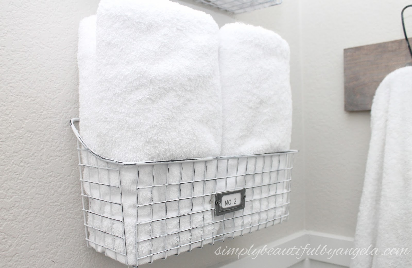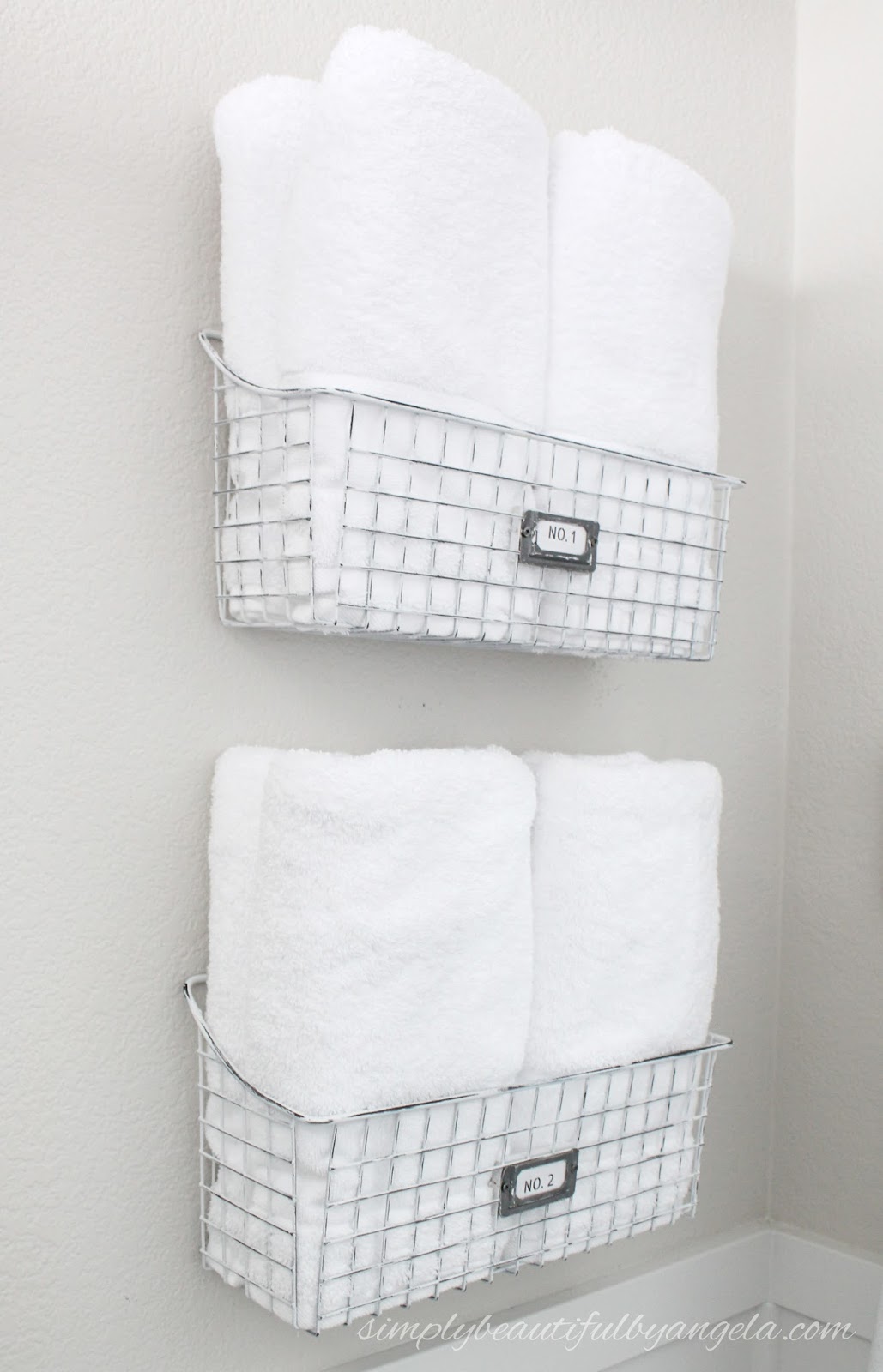 When I was designing our new master bathroom one of the very first ideas that I had was to put some baskets on the wall to hold extra towels. I liked that it would help it feel “spa like” in here.