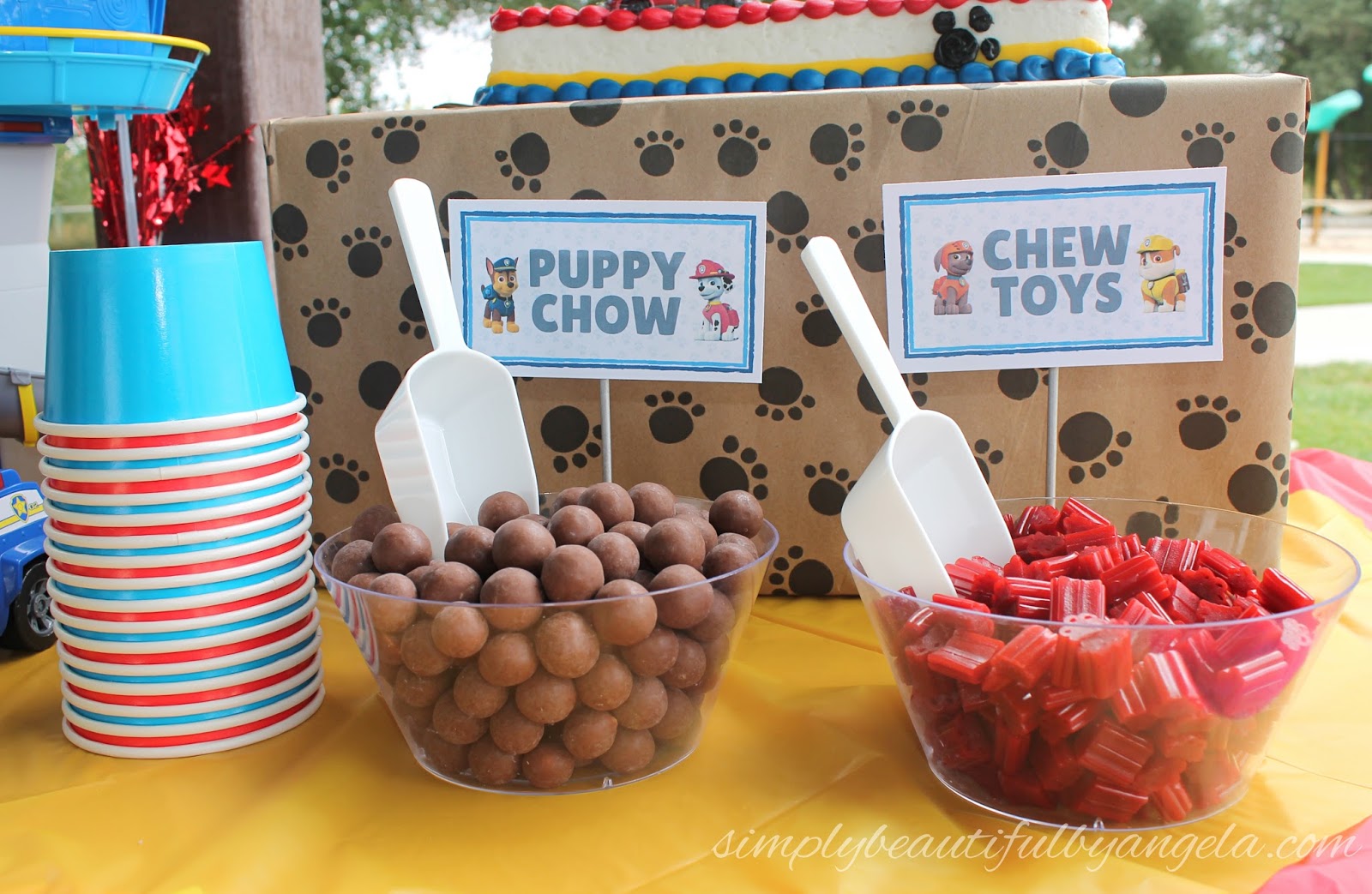 The cute Paw Patrol topping labels were the perfect touch and I hot glued them to clothespins that attached to these small white bowls.