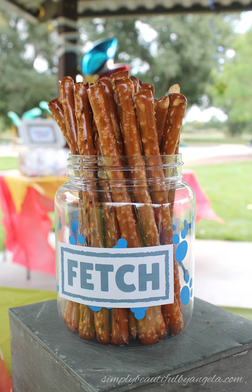 And of course it wouldn’t be a theme party without giving everything some type of cheesy name. So the chips were labeled as “paw-tato chips” and the fruit salad was “fruit kibble!” Similar labels can be found here.