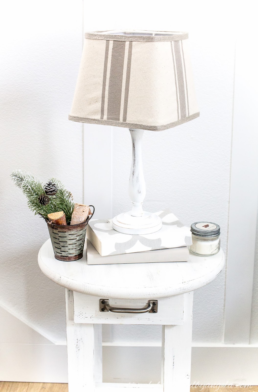 I may distress the base a little more to bring out more of the wood but for now I like how the white pops against the shade.