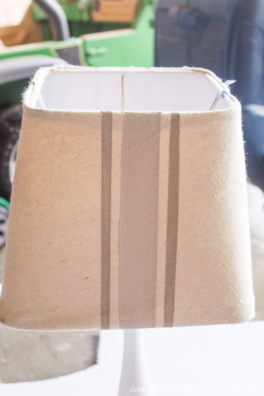 I'm glad to see I'm not the only one with stuff orphaned in the garage 🙂 I love the lamp and the shade is awesome. What a great update with the stripes and the trim. For $2 investment you now have a beautiful lamp for your home!